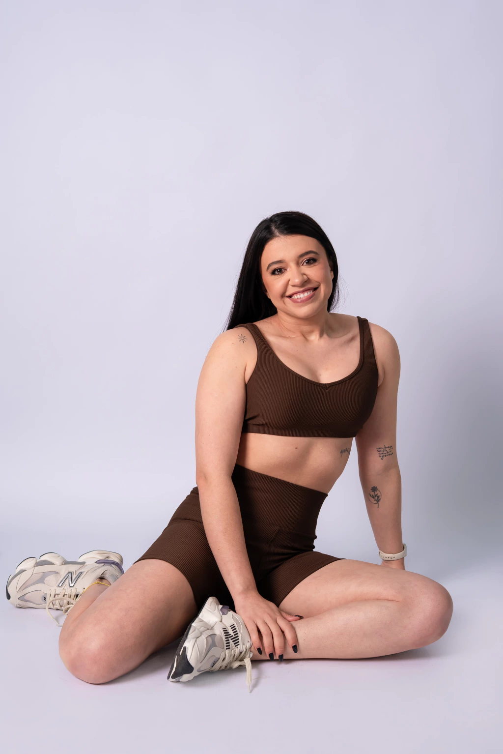 Conjunto canelado marrom composto por top e short de cintura alta.