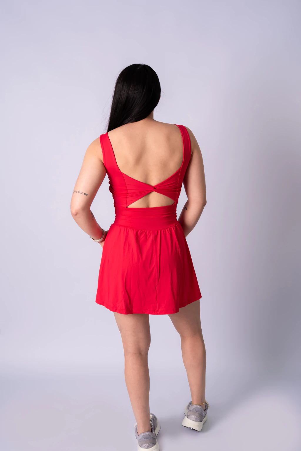 Conjunto vibrante em tom de vermelho, composto por top com alças largas, decote quadrado e detalhe vazado nas costas, e saia esportiva com caimento leve.