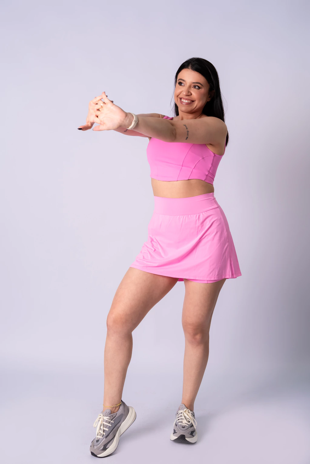 Conjunto vibrante em rosa bebê, composto por top com alças largas, decote quadrado e detalhe vazado nas costas, e saia esportiva com caimento leve.