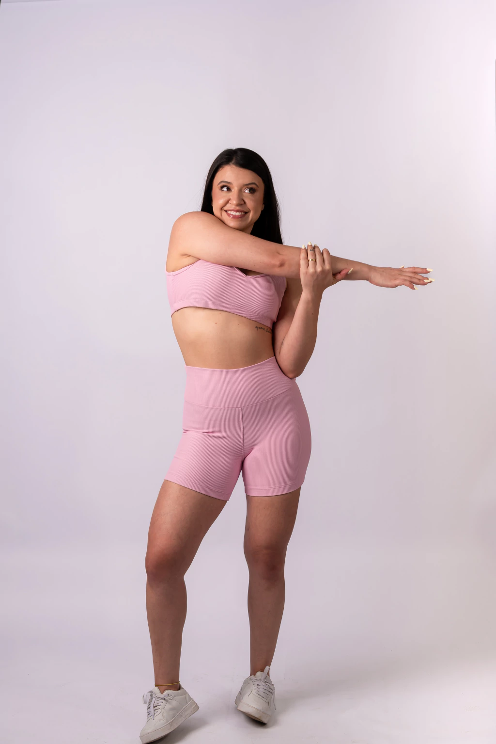 Feito em tecido canelado de toque macio e alta elasticidade, o conjunto oferece sustentação leve e liberdade total de movimento. O top possui modelagem anatômica que valoriza o busto com conforto, enquanto o shorts de cintura alta proporciona ajuste firme e elegante.