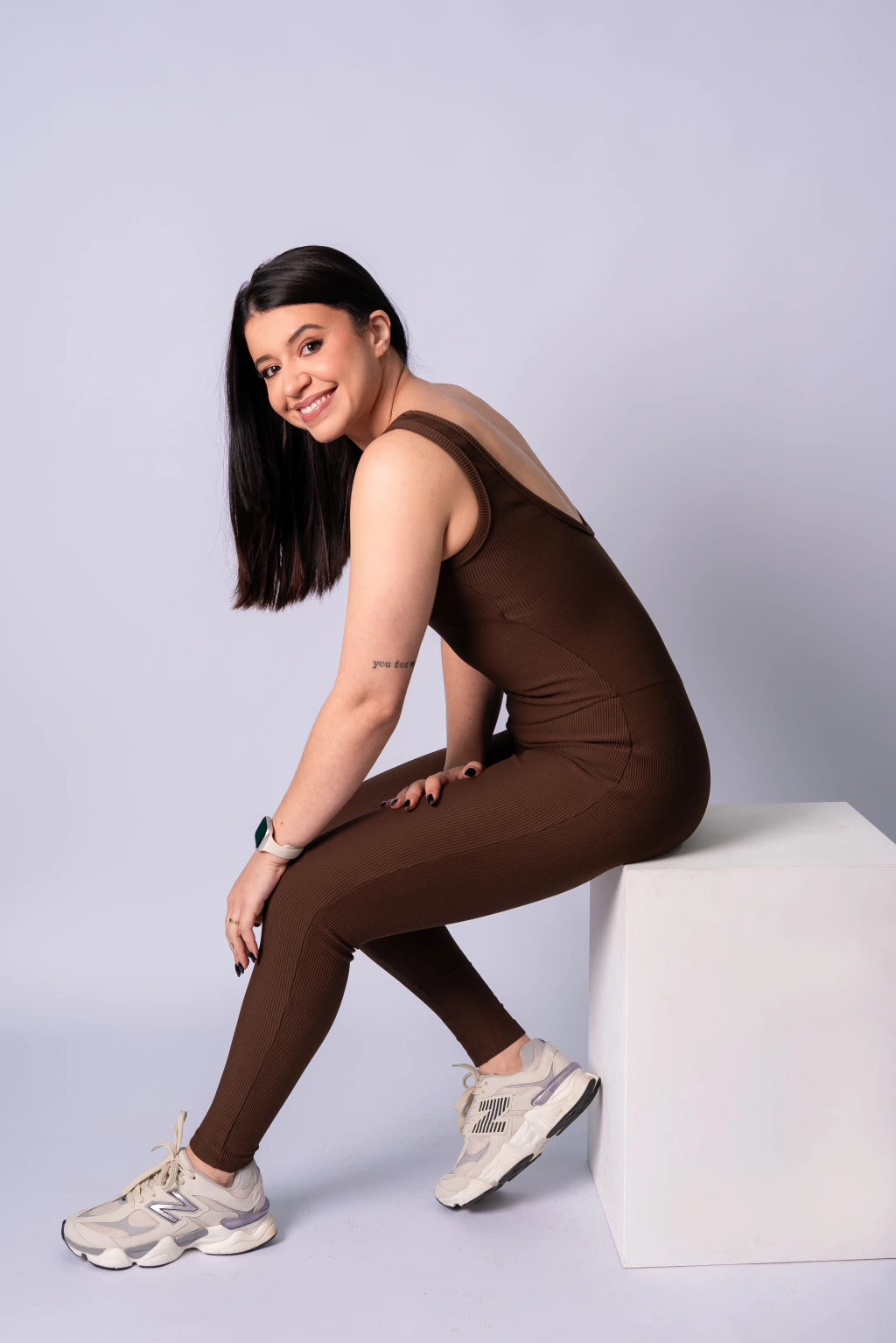 Macacão canelado em tom marrom, com modelagem que valoriza o corpo e traz conforto em qualquer ocasião.