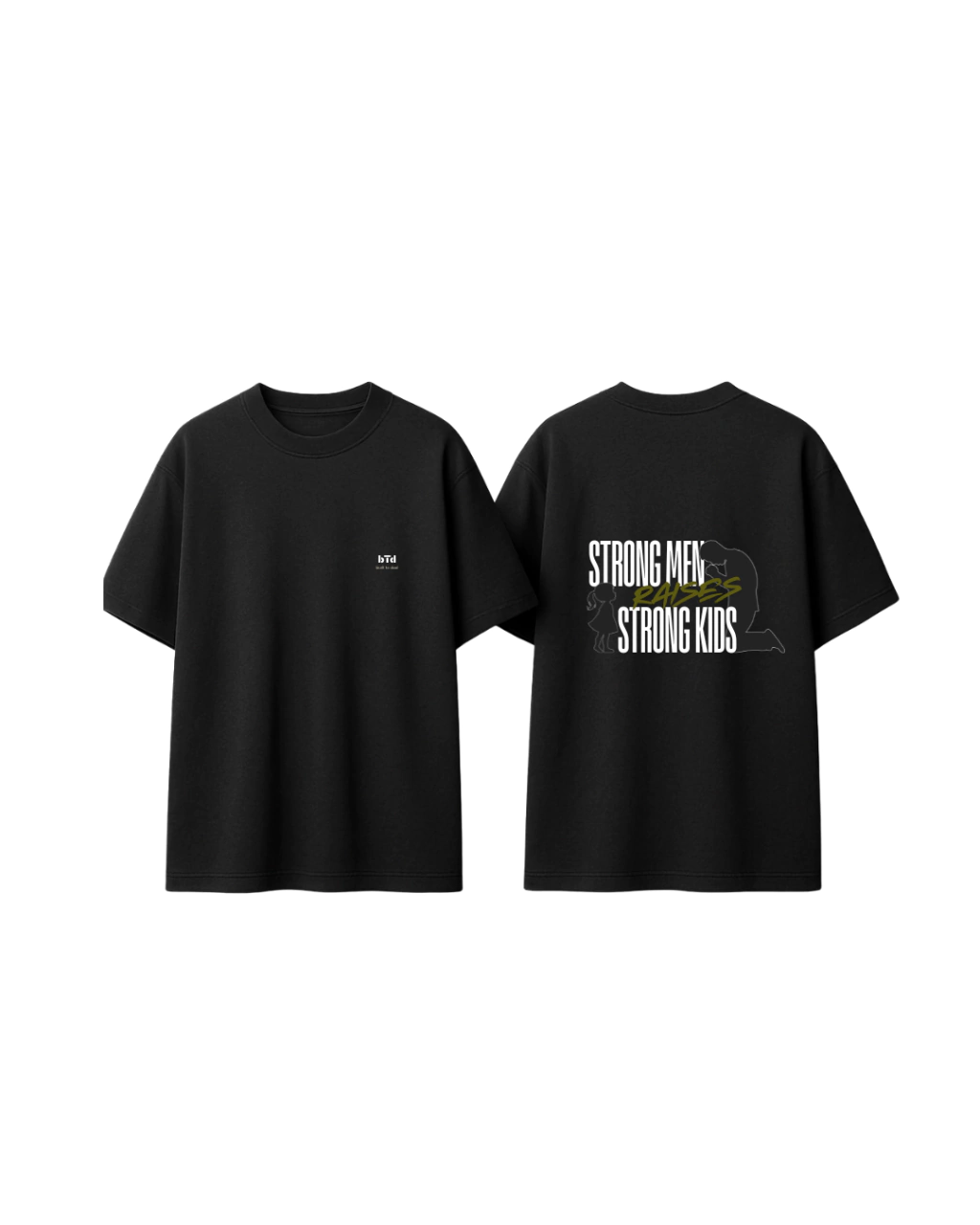 Camiseta oversized em algodão premium, com estampa frontal discreta e arte nas costas com a frase “Strong men raise strong kids”.