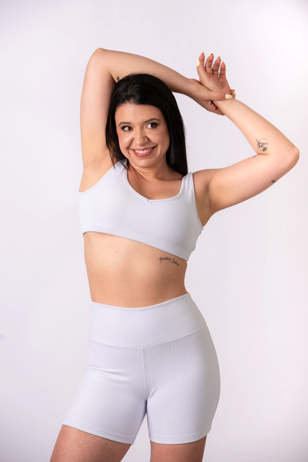 O top possui modelagem anatômica que valoriza o busto com conforto, enquanto o shorts de cintura alta proporciona ajuste firme e elegante.